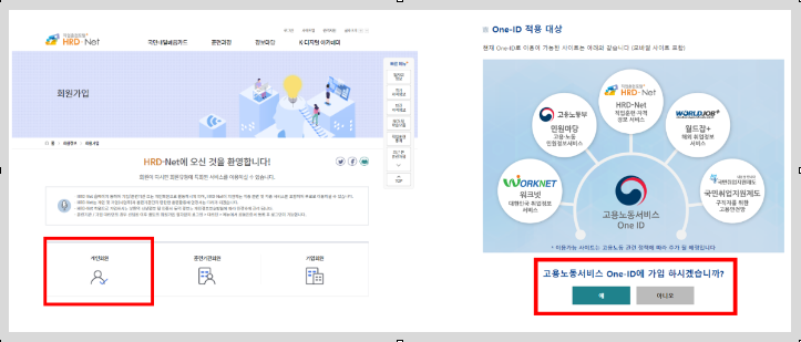 1. HRD-Net 가입 절차 HRD-Net 직업훈련포털에 방문하여 '개인회원' 선택 후 '고용노동서비스 One ID'를 이용해 회원가입을 진행하세요.
